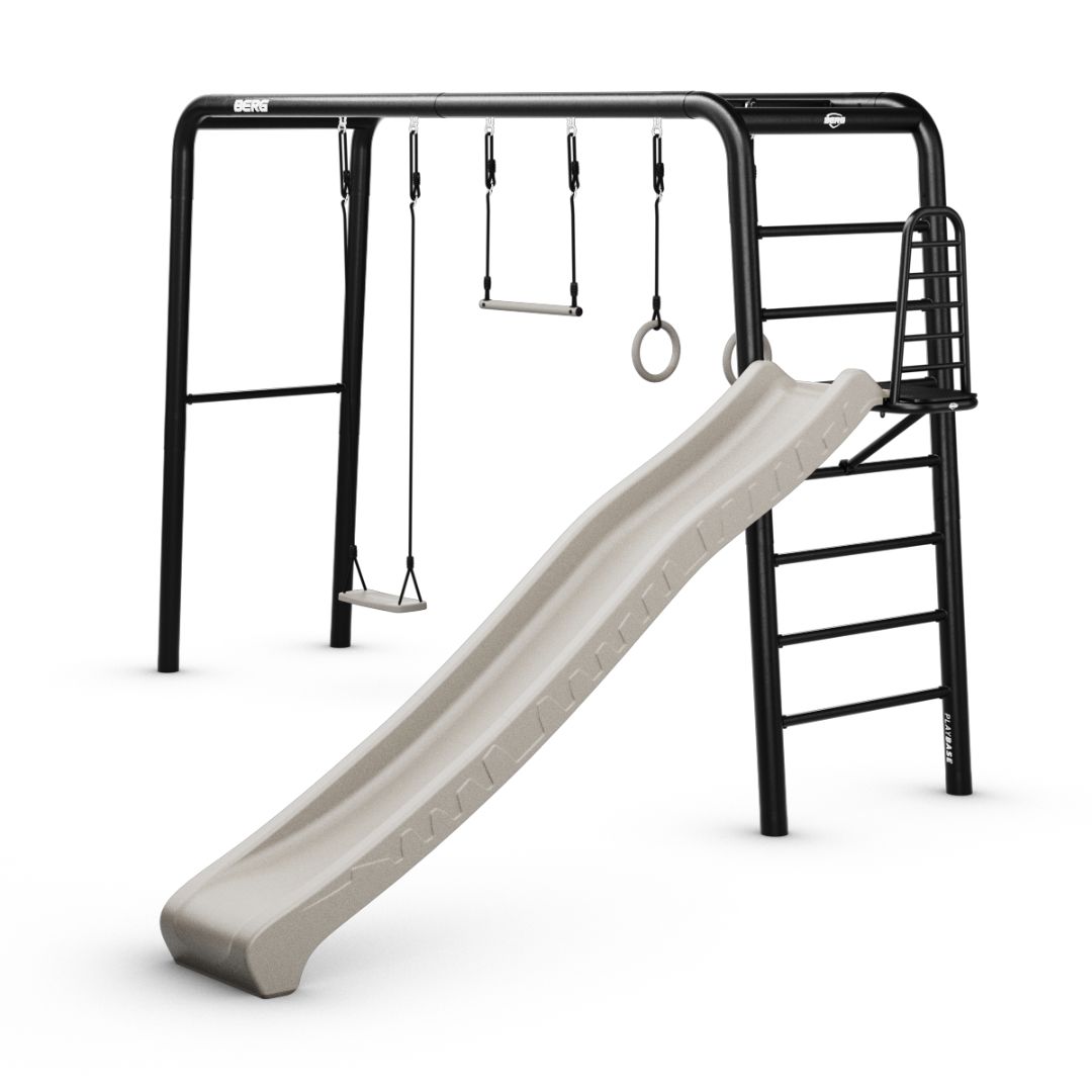 The BERG PlayBase Slide + Platform is made from high-quality materials suitable for year-round use. Its UV protection ensures that the modern grey color of the slide remains vibrant for years without fading. The platform is safe and easy to access via the ladder side of the PlayBase and securely attaches to the frame. The platform also includes a safety rail for children to hold onto as they prepare to slide.