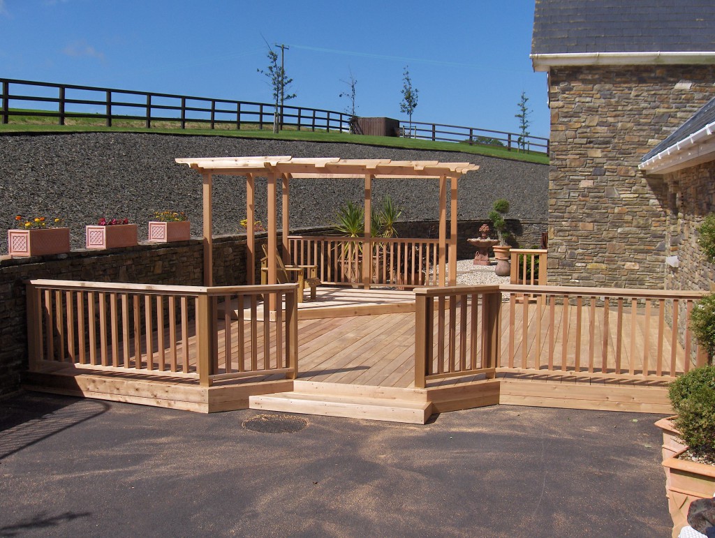 This Cedar Wood Deck fitted with a Cedar Wood Pergola to match the deck, creating a consistent finish and enhancing the look of the deck.