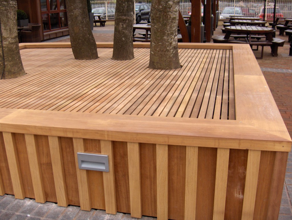 This decking was designed and fitted in a bar/ restaurant in Cork. A large Elm tree, major feature of the garden was incorporated into the decking and seating design.