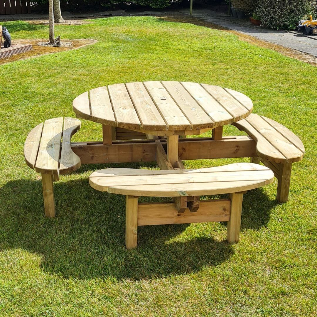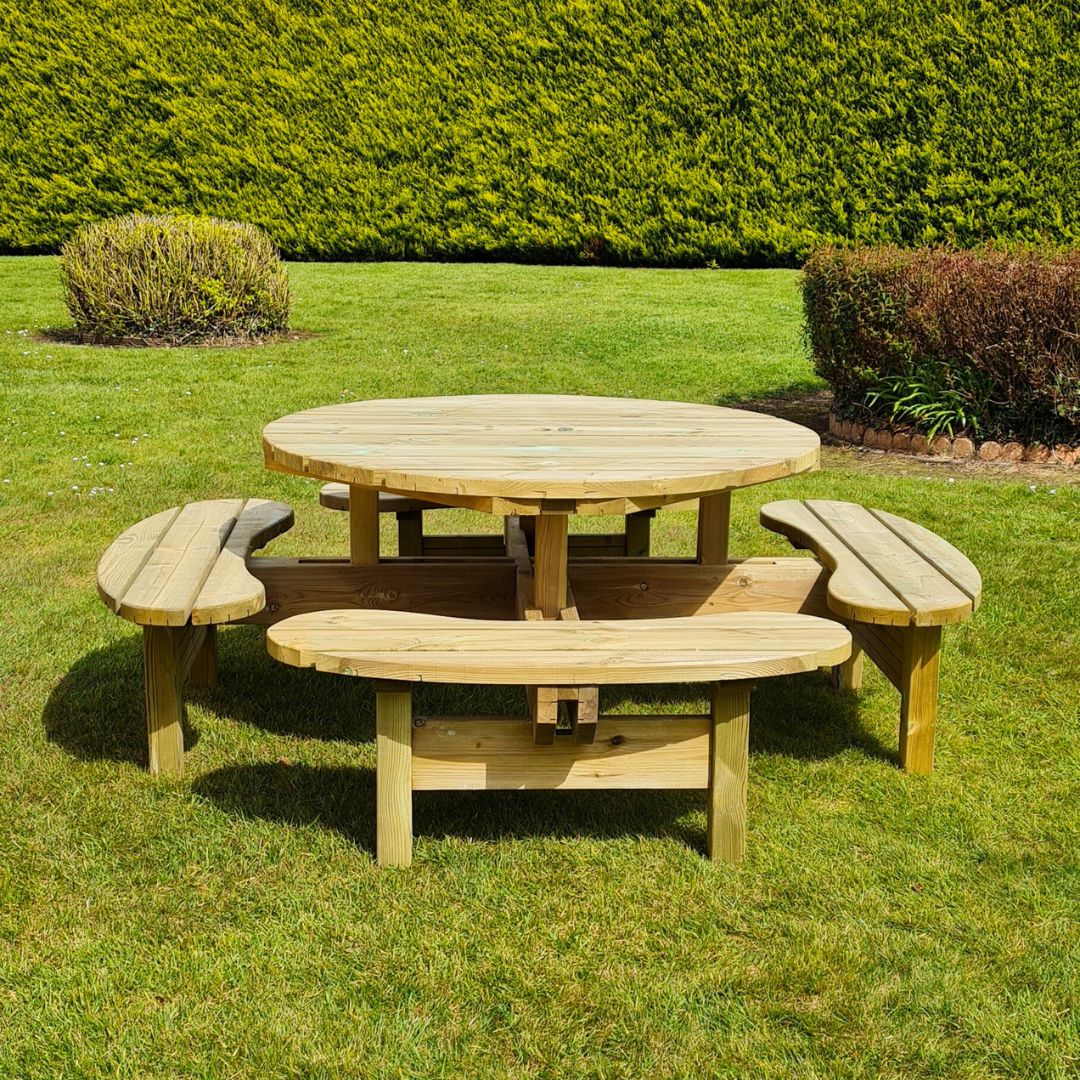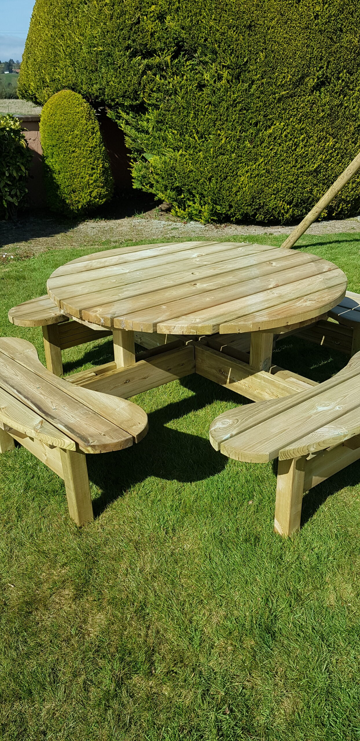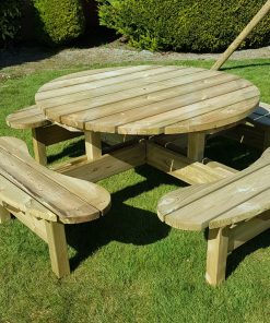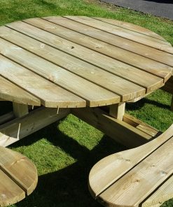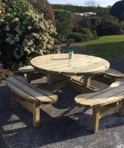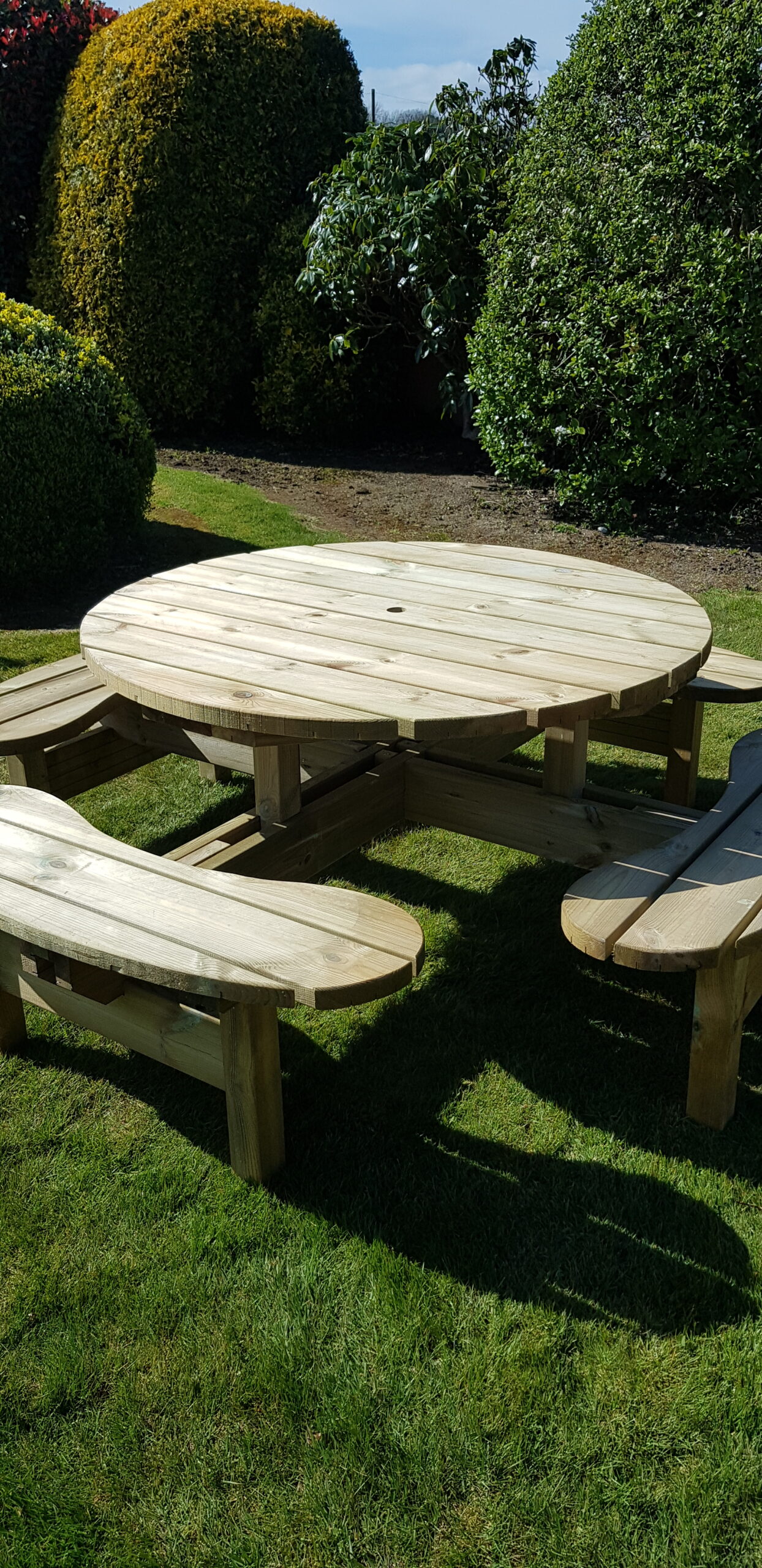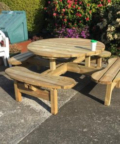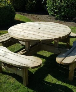 The Dunmore Round Picnic Table is manufactured using heavy duty, pressure treated timber and the anti warp grooving offers a long lifespan. This picnic table comfortably seats 8 people and also features a hole in the center of the table for a parasol. This is the ideal table for both home garden and commercial use outside a bar, restaurant, cafe or public space. Check out the rest of our garden furniture range here.