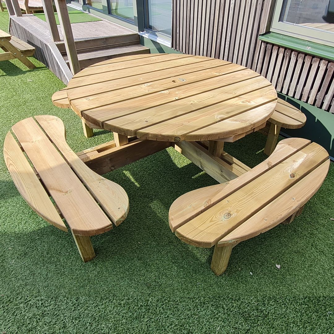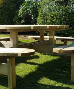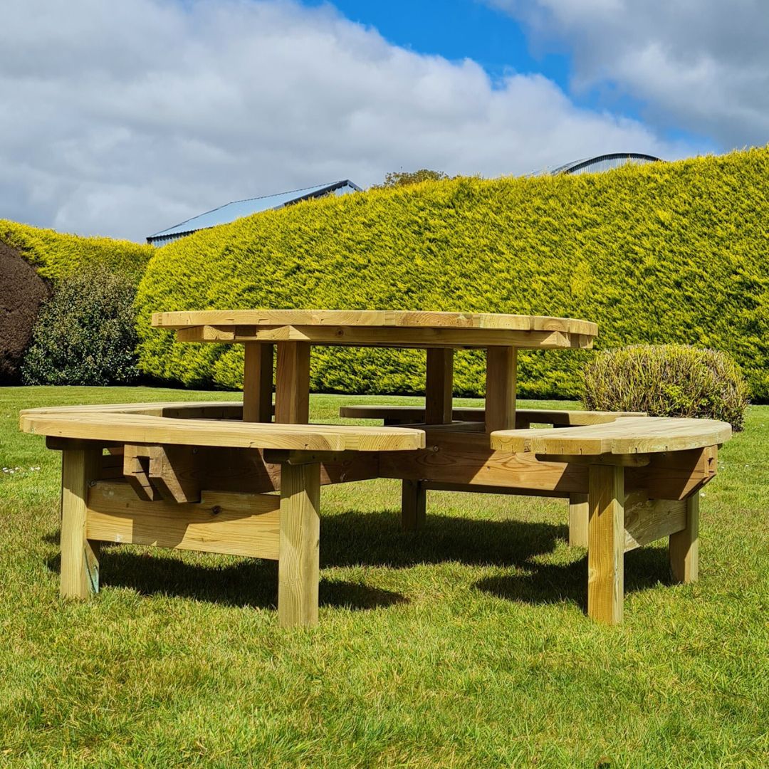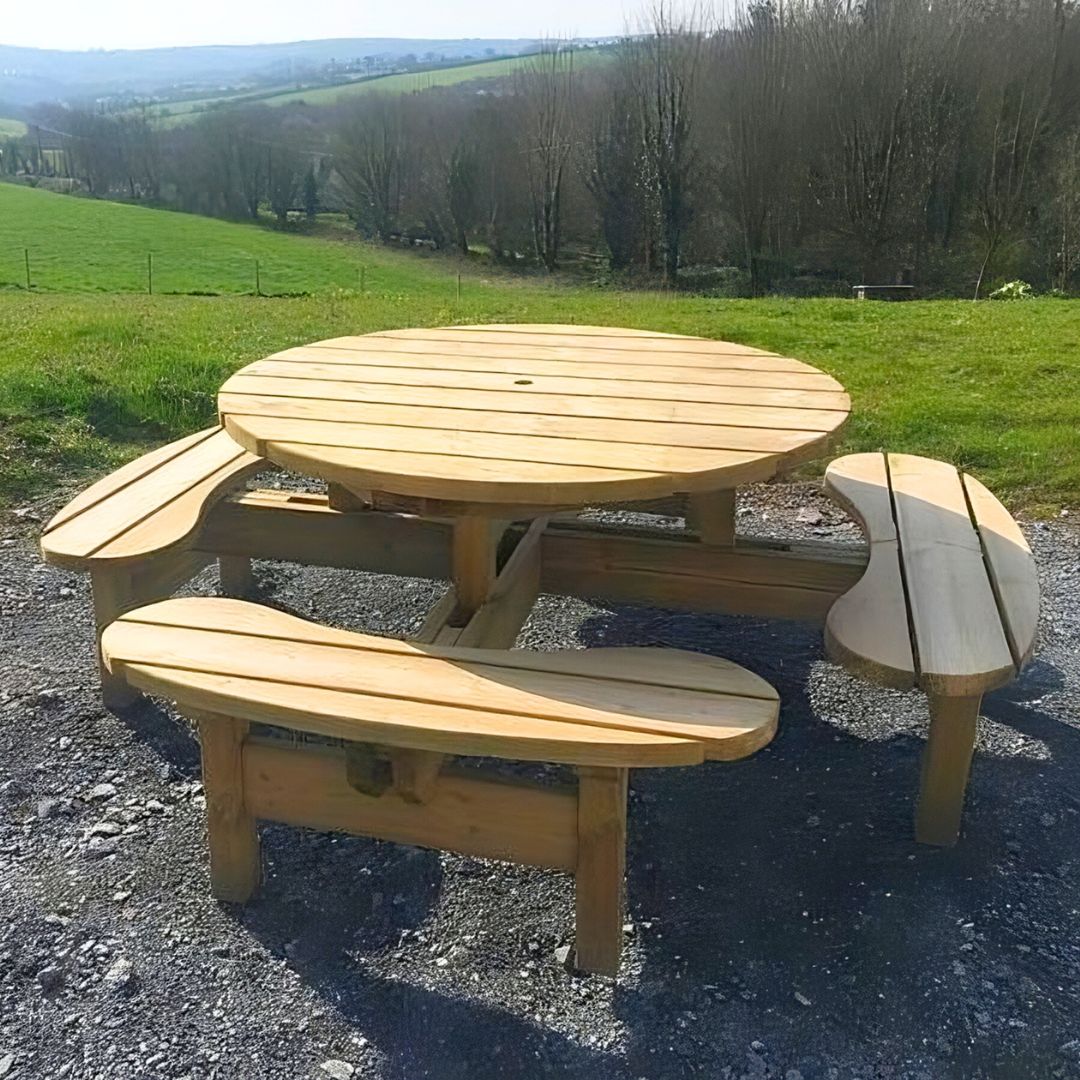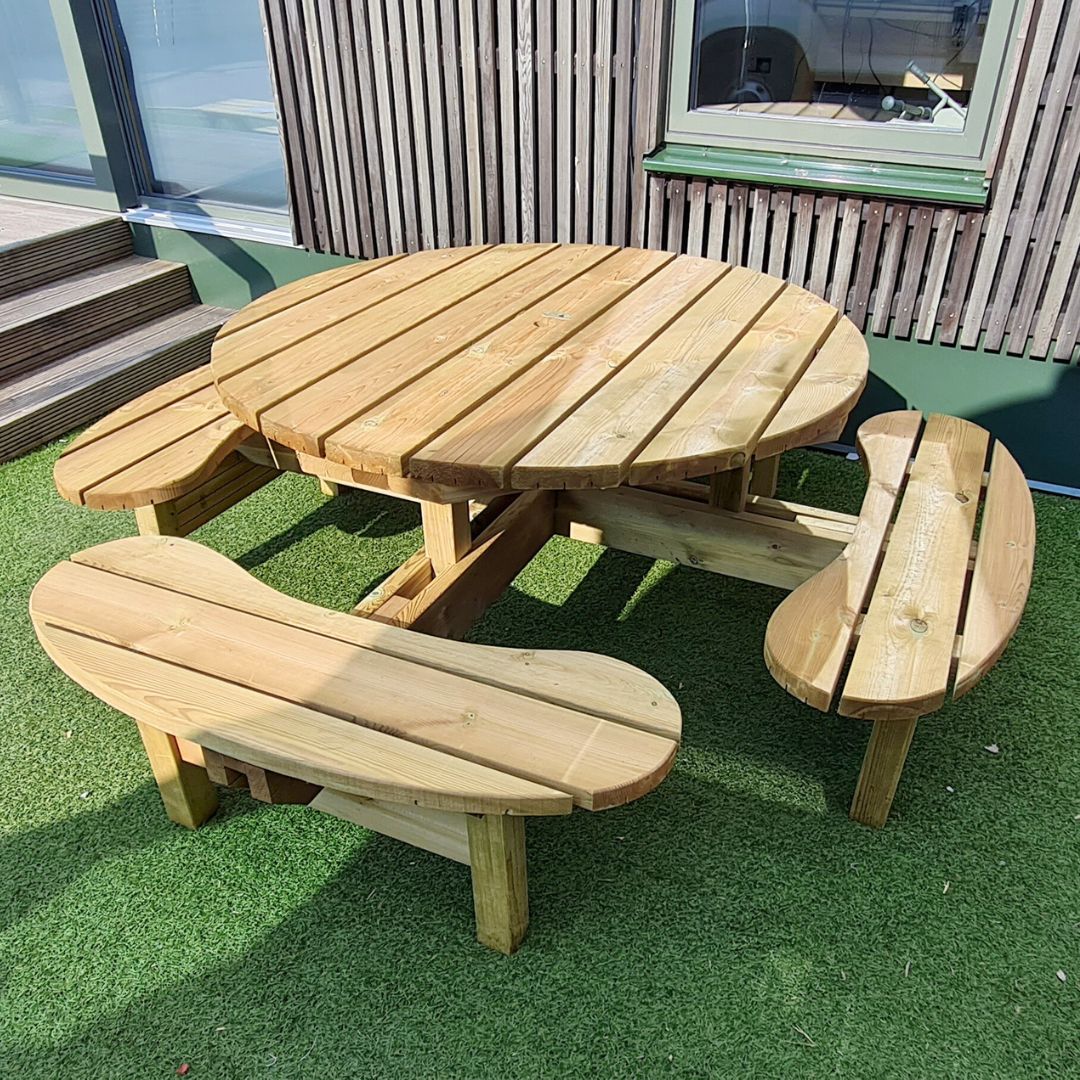 The Dunmore Round Picnic Table is manufactured using heavy duty, pressure treated timber and the anti warp grooving offers a long lifespan. This picnic table comfortably seats 8 people and also features a hole in the center of the table for a parasol. This is the ideal table for both home garden and commercial use outside a bar, restaurant, cafe or public space. Check out the rest of our garden furniture range here.