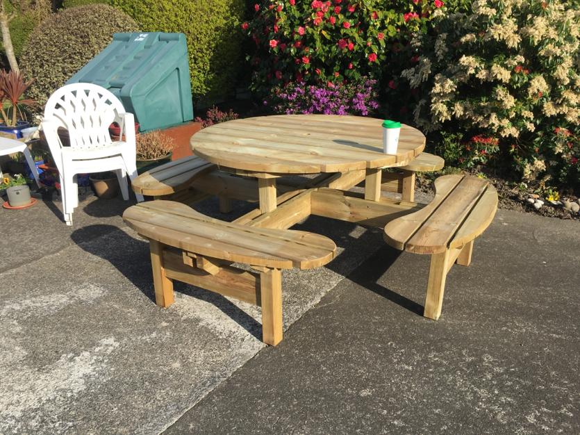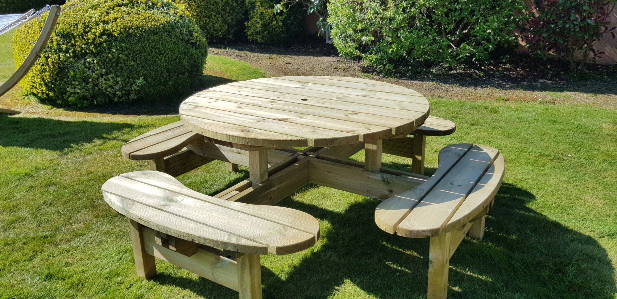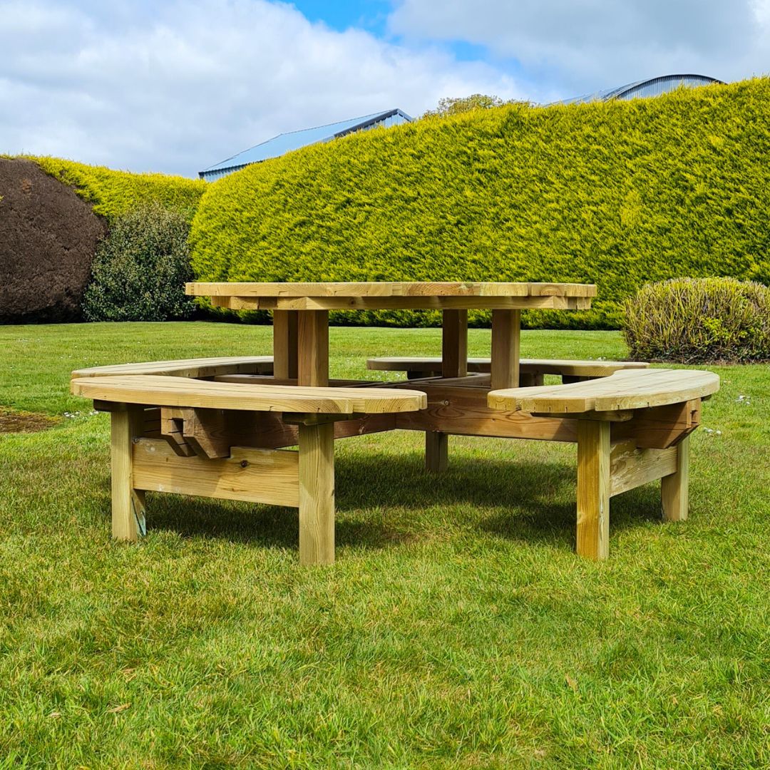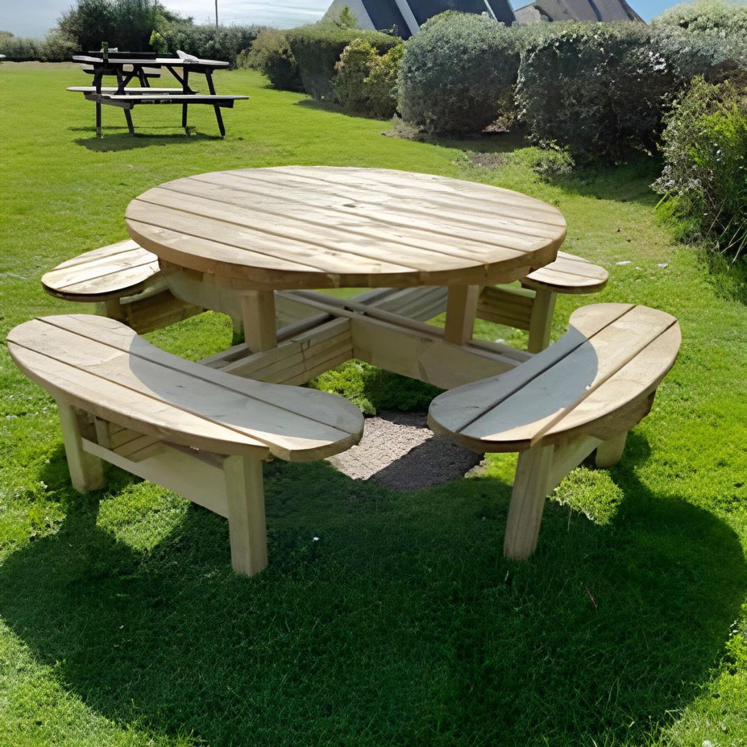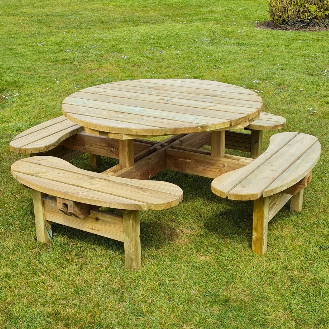 The Dunmore Round Picnic Table is manufactured using heavy duty, pressure treated timber and the anti warp grooving offers a long lifespan. This picnic table comfortably seats 8 people and also features a hole in the center of the table for a parasol. This is the ideal table for both home garden and commercial use outside a bar, restaurant, cafe or public space. Check out the rest of our garden furniture range here.