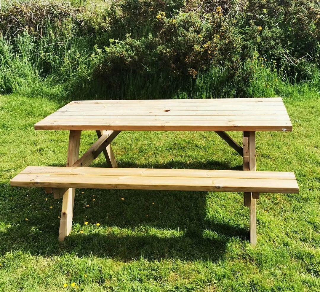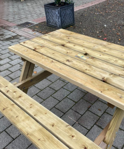 This beautiful wooden 6 seater picnic table is ideal for any garden / public parks, beer gardens or any outdoor location.  Made from high quality timber and is pressure treated for strength and durability. There is also an umbrella/ parasol hole in the centre of the table to provide shade from that summer sun! This Picnic Table is 1.4 metres in length and is also available in the larger 1.8m size here.