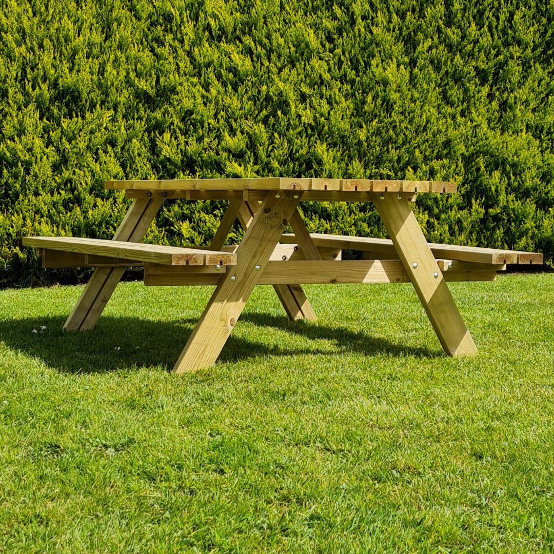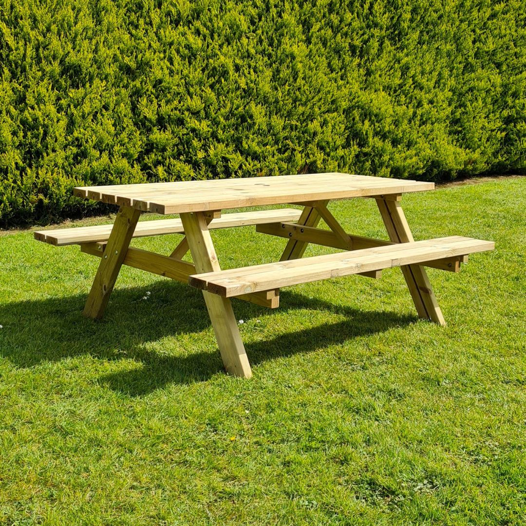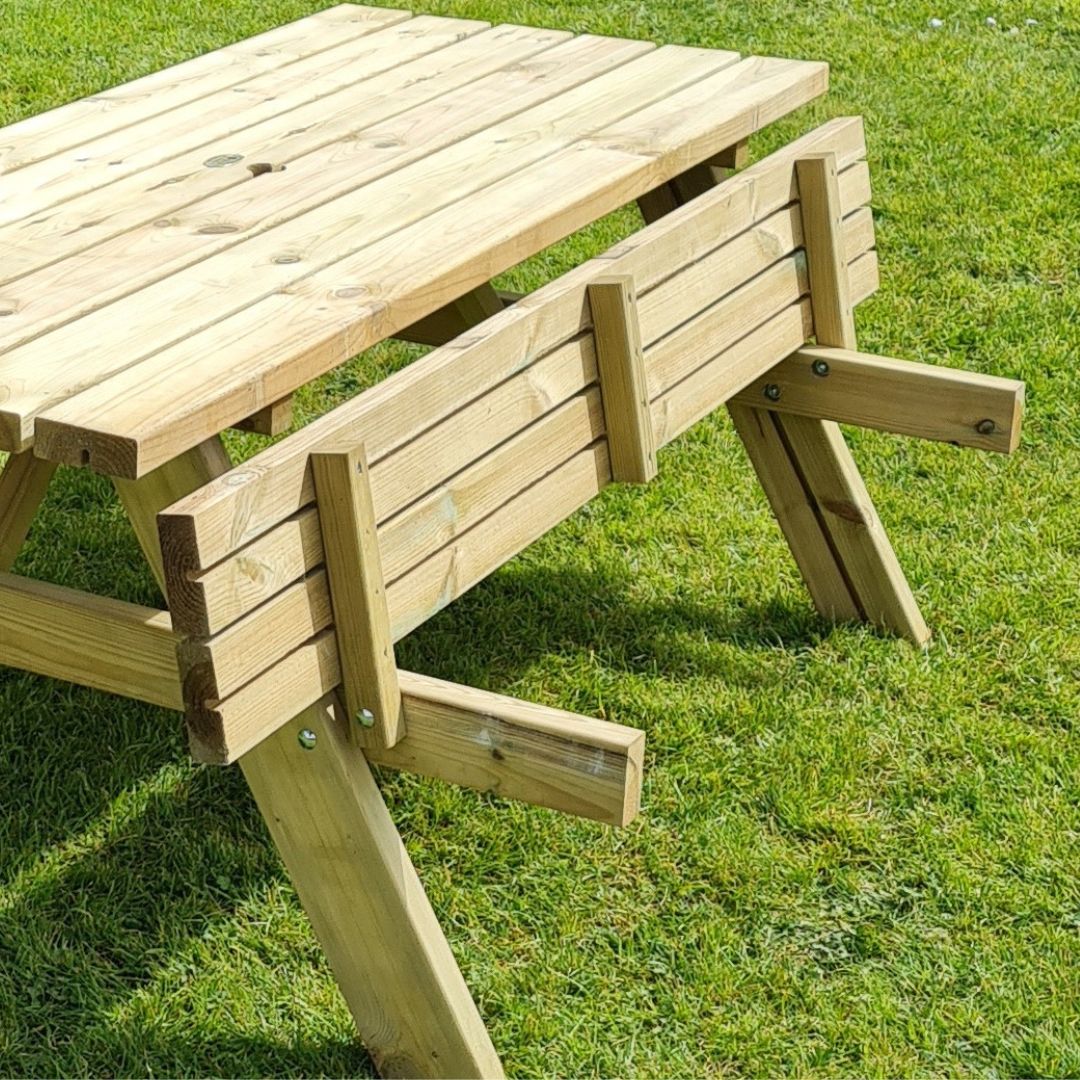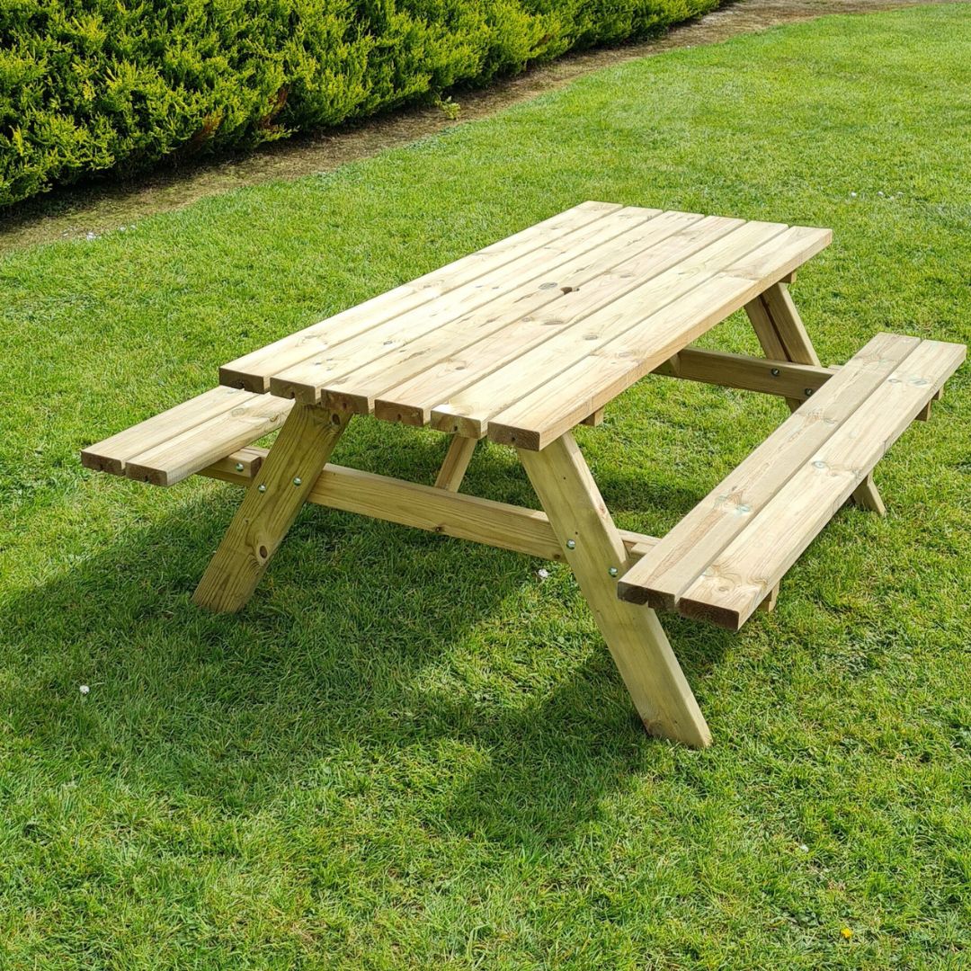 This beautiful wooden 6 seater picnic table is ideal for any garden / public parks, beer gardens or any outdoor location. Made from high quality timber and is pressure treated for strength and durability. There is also an umbrella/ parasol hole in the centre of the table to provide shade from that summer sun! This Table is 1.8 metres in length. Also available in a smaller 1.4m length here,
