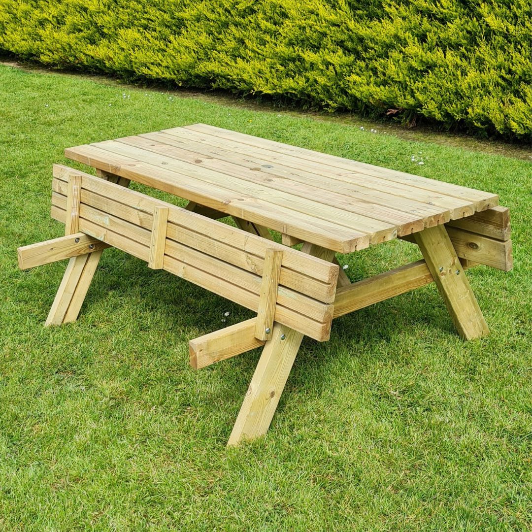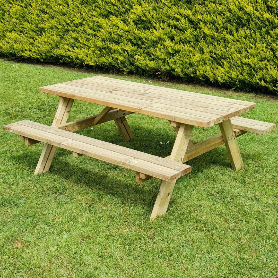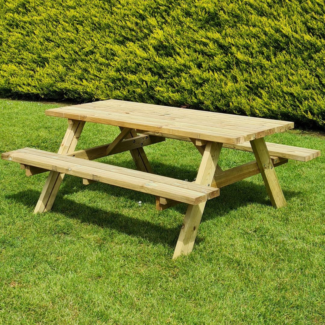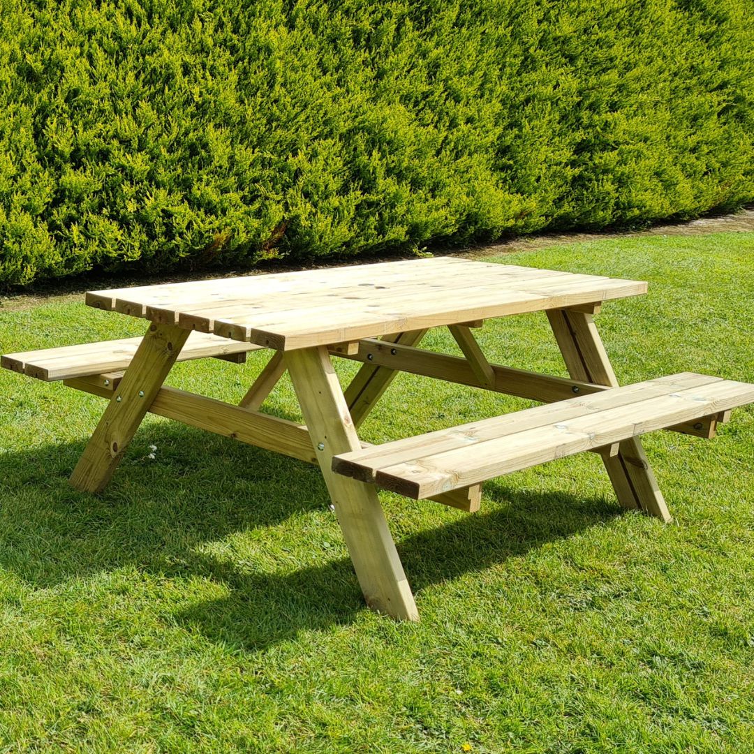 This beautiful wooden 6 seater picnic table is ideal for any garden / public parks, beer gardens or any outdoor location. Made from high quality timber and is pressure treated for strength and durability. There is also an umbrella/ parasol hole in the centre of the table to provide shade from that summer sun! This Table is 1.8 metres in length. Also available in a smaller 1.4m length here,